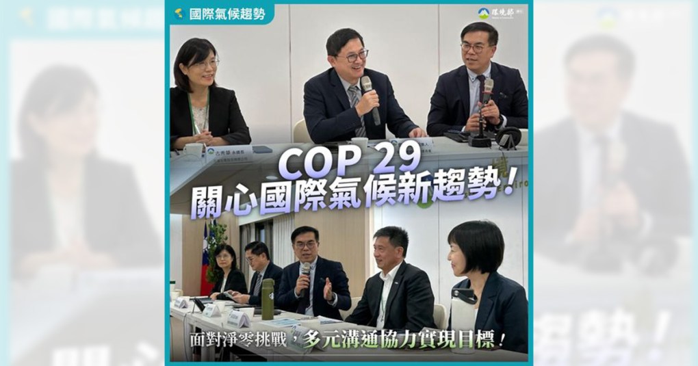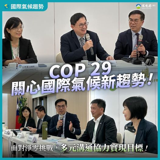 11月15日,環境部已舉辦「COP29 提升氣候行動的決心」系列論壇,戰情中心也邀請總統府氣候變遷對策委員會童子賢副召集人、彭双浪委員、師大葉欣誠教授,以及宏碁與友達光電公司永續長參與,以期掌握最新資訊。