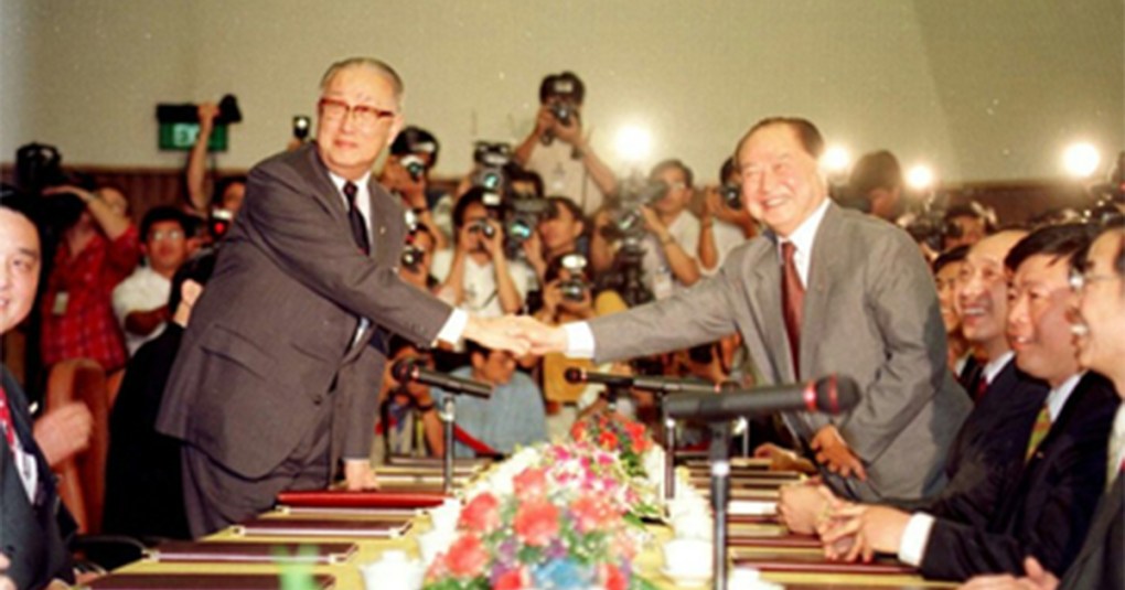 ▲辜振甫(左)與汪道涵(右)在新加坡海皇大廈握手(圖係取自維基百科)。