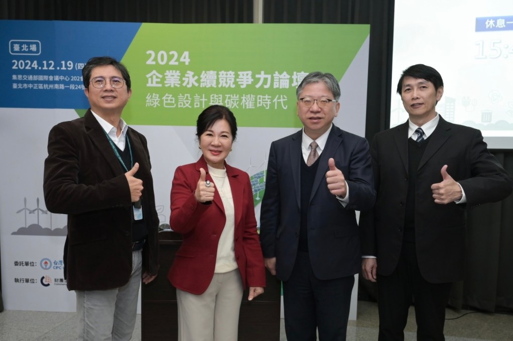 ▲「2024企業永續競爭力論壇」與會貴賓,(左起)百事益國際公司林志青總經理、商研院張皇珍副院長、環境部資源循環署許智倫副署長、彩宸生活事業公司邱明仁總經理合影(照片係商業發展研究院提供)。