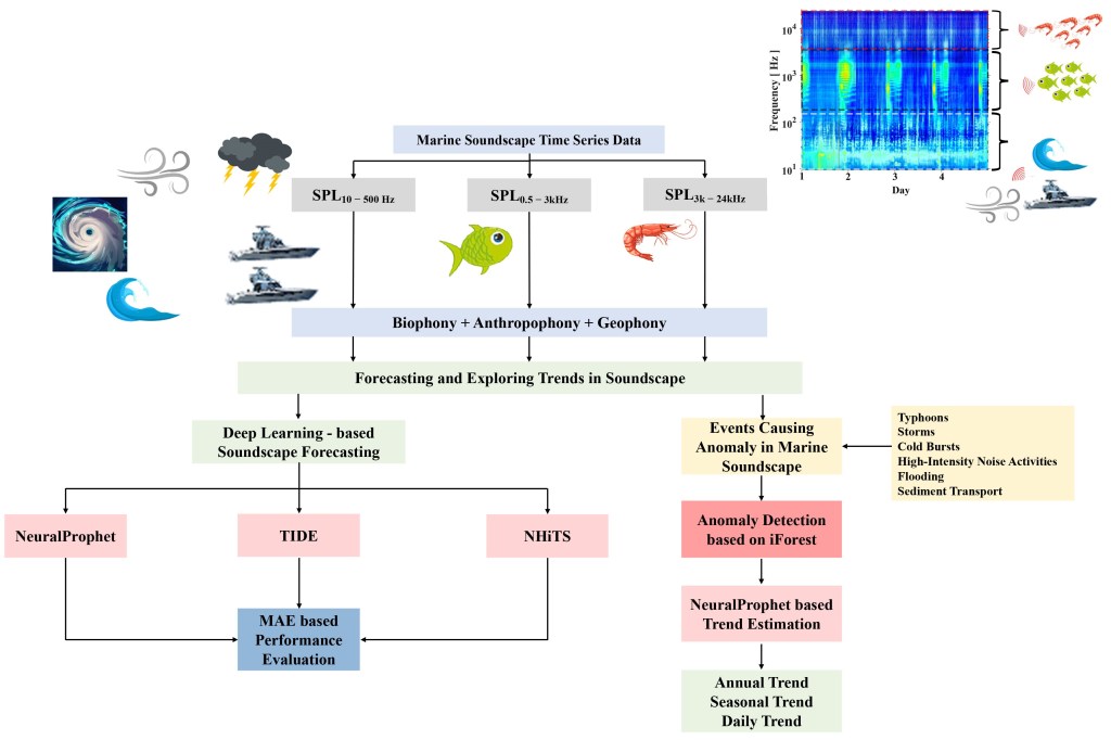 該研究團隊利用2017年於台灣海峽所蒐集之海洋被動聲學監測資料進行分析,且運用基於非監督式學習的孤立森林(Isolation Forest, iForest)技術,成功辨識導致聲音水準突變的異常事件,同時,也評估深度學習模型在趨勢估計與音景預測上的表現,並進一步探討影響其準確性的因素。