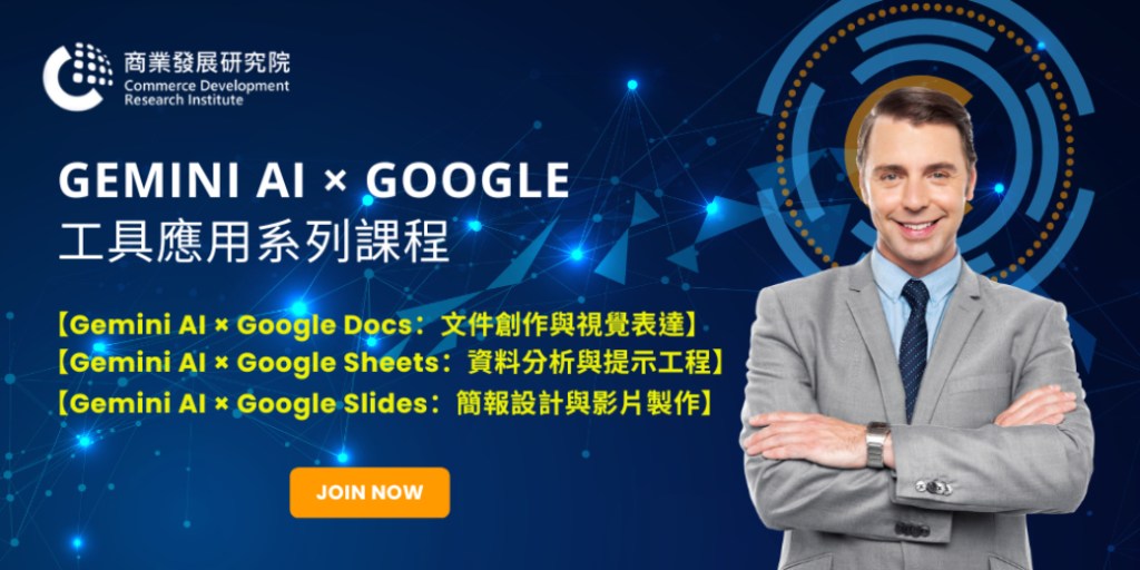 【產學政研連線】企業面對如何運用AI,以強化本身的競爭力?此時,商研院(CDRI)數位創新學院,推出「Gemini AI × Google工具應用系列課程」,將助業界一臂之力。該課程係結合Google Workspace的Docs、Sheets及Slides,協助職場人士在「文字、數據、視覺」3大領域全面升級,真正將AI轉化為工作利器。