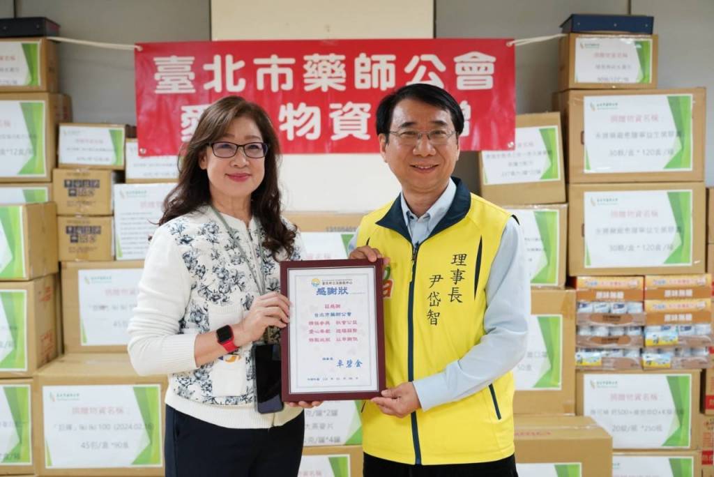 ▲臺北市藥師公會捐贈物資給臺北市三玉啟能中心,中華民國腦性麻痺協會卓碧金理事長(左)致送感謝狀給尹岱智理事長(照片係台北市藥師公會提供)。