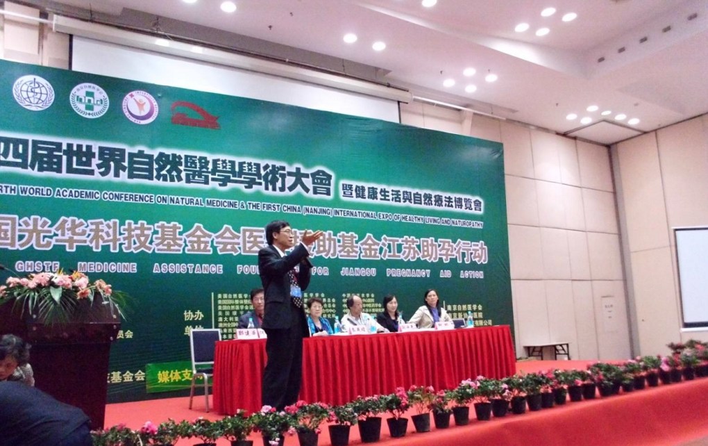 ▲何永慶執行長(站立者)致力於中華自然醫學的推展,不遺餘力;圖為他15年前出席「第4屆世界自然醫學學術大會」發表「節醫減藥、健康六通」論文的情景(照片係自然醫學文摘雜誌社提供)。