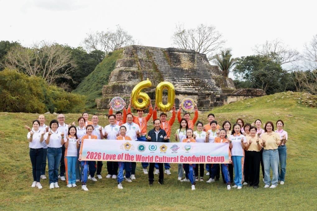 貝里斯也是古馬雅文明的重要核心區域,全境擁有超過1,400處已記錄的遺址,包括聚落、金字塔、祭壇與觀星台等。親訪團前往知名馬雅遺址阿爾頓哈(Altun Ha),在馬雅語中意為「石頭水」,此處以出土翠綠的「太陽神頭像」玉雕聞名。該遺址在西元前200年,曾是重要的宗教與貿易中心。團員登上壯觀的太陽神祭壇,手持象徵太極門氣功養生學會60週年的金色「60」氣球,為揚善百國寫下歷史新頁。親訪團成員馬小蘭表示,馬雅文明的興盛、源於長時間的累積、族群的團結與分工合作,然而,當貪念與戰爭興起,再輝煌的文明也終將消逝。站在遺址前,她反思當代人類也正站在關鍵抉擇點上一一選擇戰爭,或許是終結文明的開端;而選擇和平,才能為人類留下延續的希望。