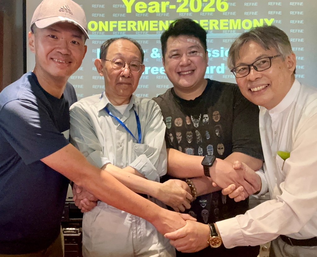 ▲王杉財院長(右1)運用他的人際關係,特別邀請周新翔(右2)、許時正(右3)及柯有騏(左1)等技藝傑出的好友相助(照片係理範全球時尚技藝學院提供)。