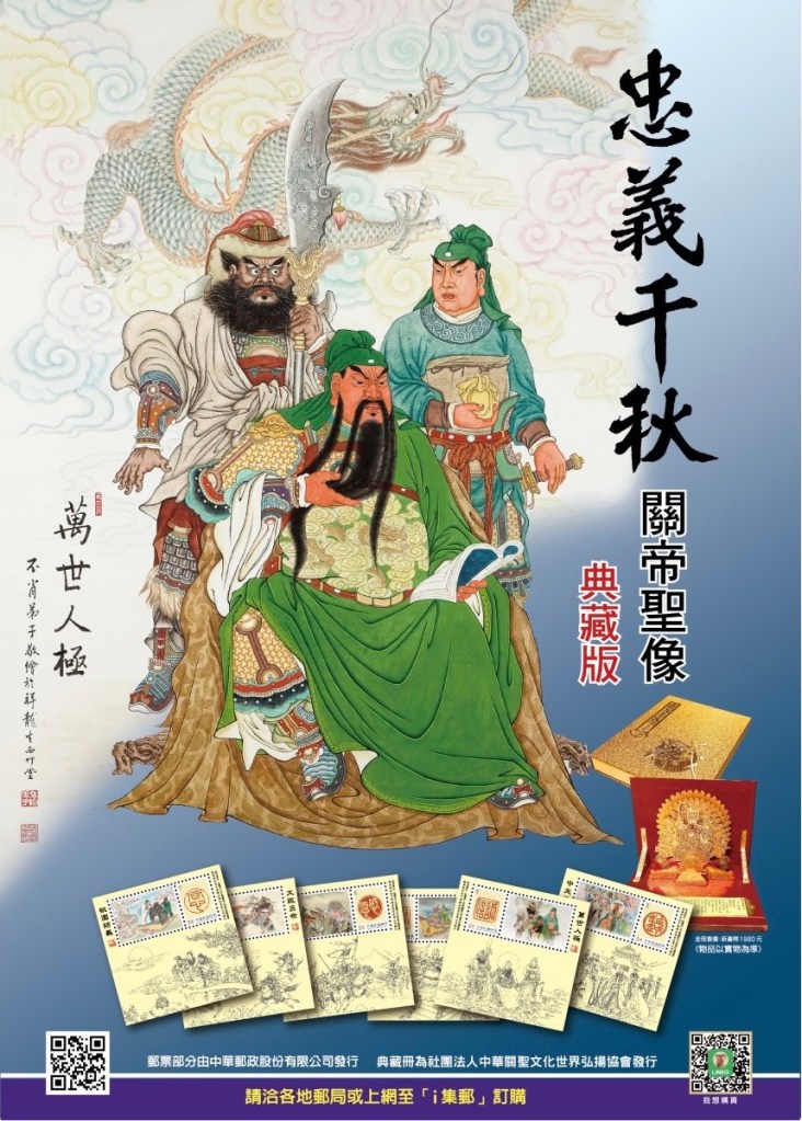 今為提升民間信仰,結合宗教與藝術,更適逢因緣俱足,中華關聖文化世界弘揚協會特與中華郵政公司,共同發行具有象徵性和突破一般文創品窠臼的藝術郵冊《忠義千秋關帝聖像典藏版》,其內容總共集合36幅全彩關聖帝君生平事蹟國畫畫作,及35尊關帝木雕聖像圖片、點石成金「關聖帝君」個人化郵票,加上中英文版翻譯說明,希望能讓世人瞭解關聖帝君聖德事蹟,同時更興起效法其忠義精神之心。