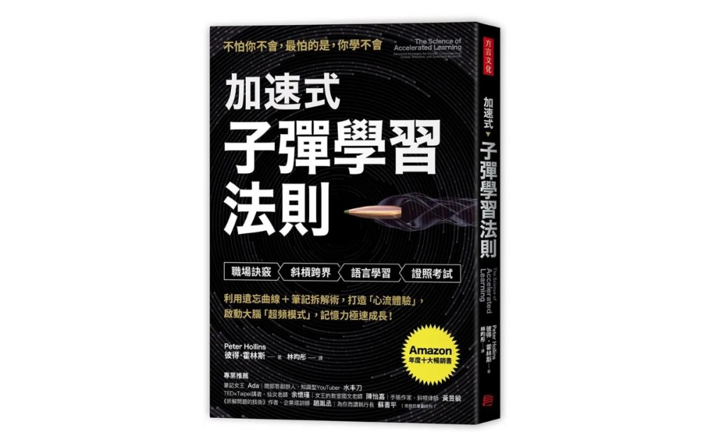 對於學習的重要性,我更是知之甚詳,看到彼得.霍林斯談《加速式.子彈學習法則》,將學習的18般武藝都寫在書中,可惜犯了寫書人的毛病,沒從看書人的角度來寫,因此他講得頭頭是道,但讀者能吸收的也很有限,能夠用到自己學習上的人則更少之又少了。