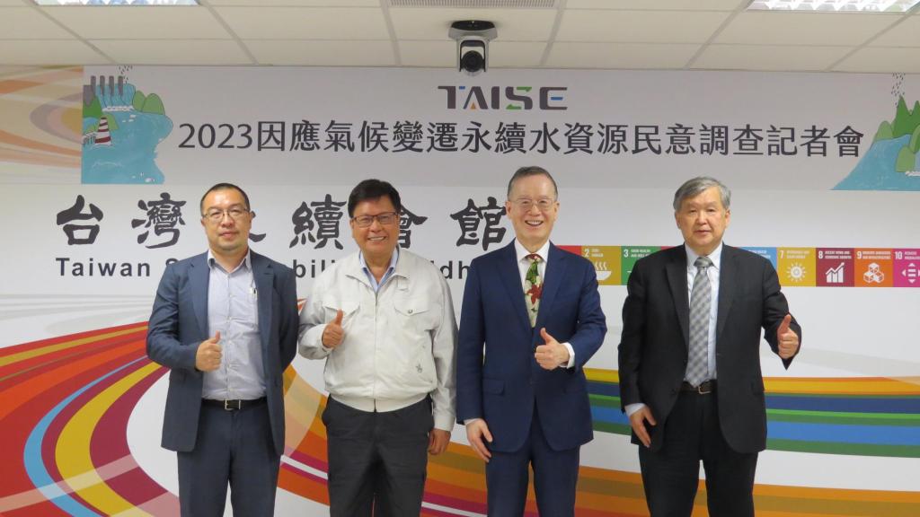 ▲《2023因應氣候變遷水資源民意調查》發布記者會中,台灣永續能源研究基金會董事長、簡又新大使(右2)與3位貴賓合影(照片係台灣永續能源研究基金會提供)。