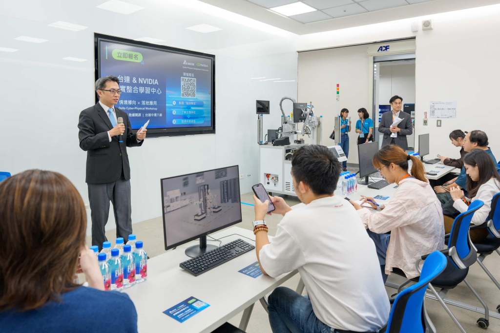 ▲台達機電事業群智能製造軟體新事業發展部陳鴻輝處長,為與會貴賓介紹:「台達&NVIDIA虛實整合學習中心」,聚焦數位雙生實境教學(照片係台達電子公司提供)。