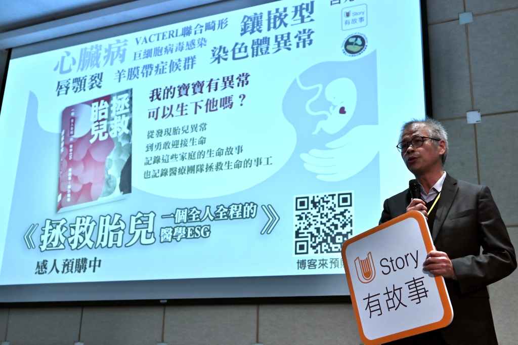 ▲有故事公司邱文通執行長,在「拯救胎兒專案記者會」倡議「五權宣言」及台灣少子化危機的解方(照片係有故事公司提供)。