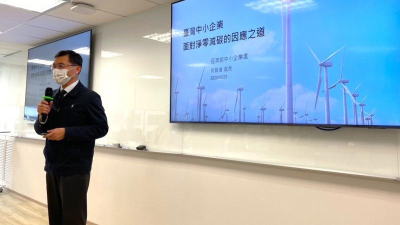 ▲經濟部中小企業處何晉滄處長,針對中小企業淨零減碳因應之道來分享(照片係台灣永續能源研究基金會提供)。